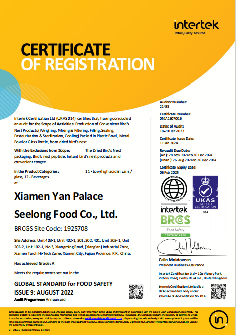 图:燕之屋获得BRC食品安全全球标准、IFS国际食品标准认证
